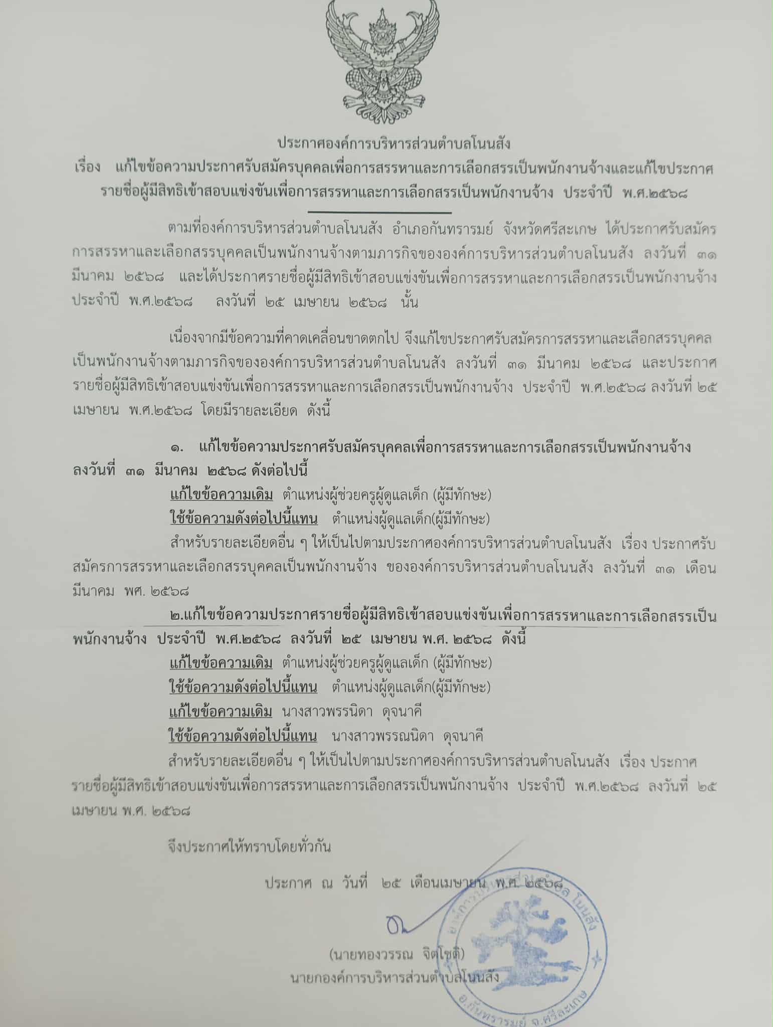 ปลัดองค์การบริหารส่วนตำบลโนนสังปฏิบัติหน้าที่แทน นายกองค์การบริหารส่วนตำบลโนนสัง