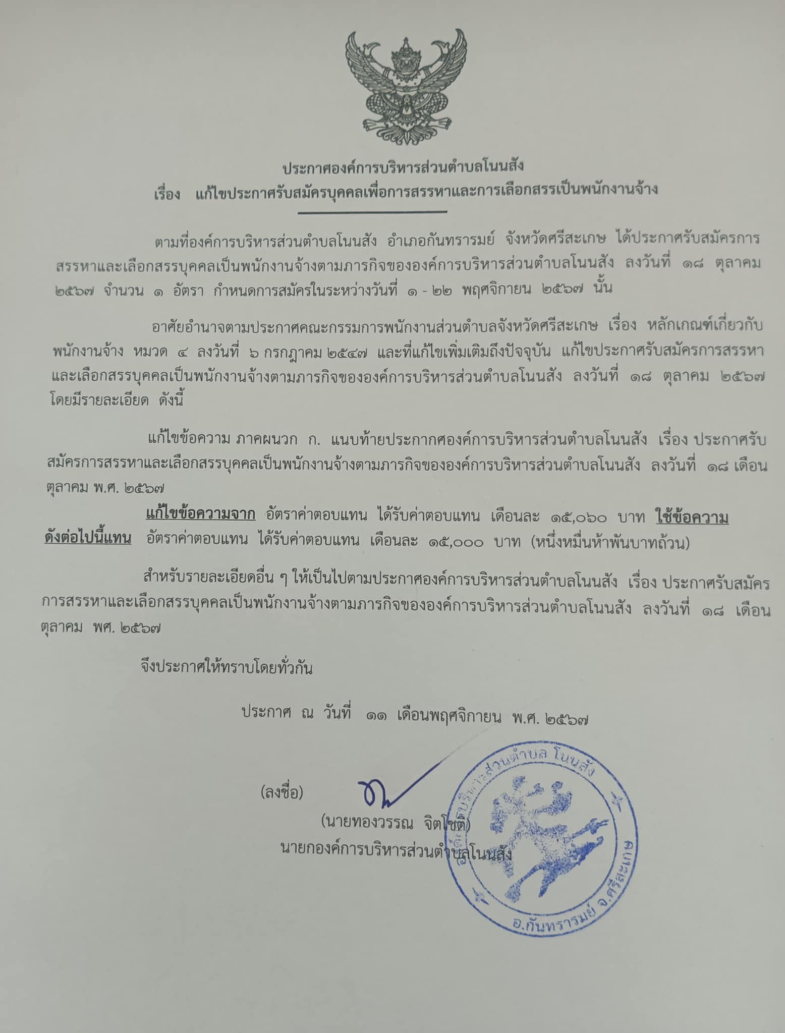 ปลัดองค์การบริหารส่วนตำบลโนนสังปฏิบัติหน้าที่แทน นายกองค์การบริหารส่วนตำบลโนนสัง